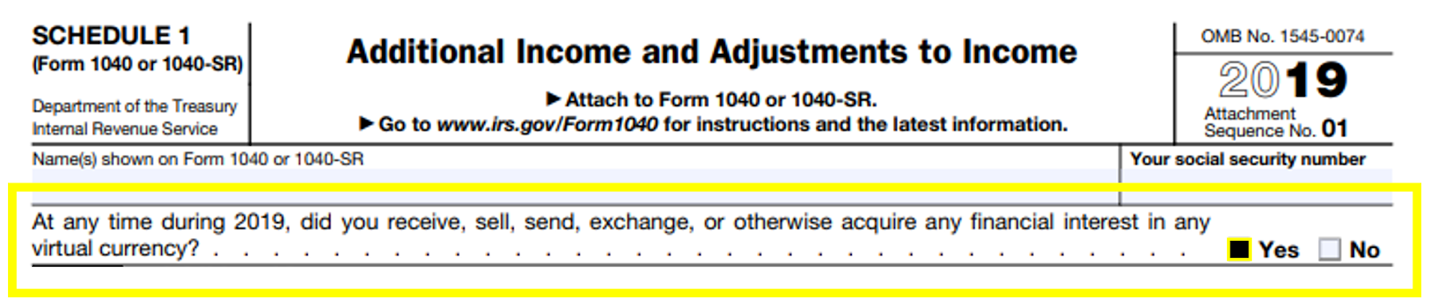 The IRS just released a new Schedule 1 for the 2019 tax season asking every taxpayer about their cryptocurrency activity. Specifically, the form requires taxpayers to respond to the following question: “At any time during 2019, did you receive, sell, send, exchange or otherwise acquire any financial interest in any virtual currency.”