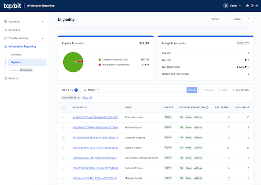 Reconciliation: Designed to display key aggregated data points enabling effective identification of discrepancies between datasets and the data successfully ingested into Taxbit. Providing a comprehensive overview to ensure alignment and accuracy between your records and Taxbit.