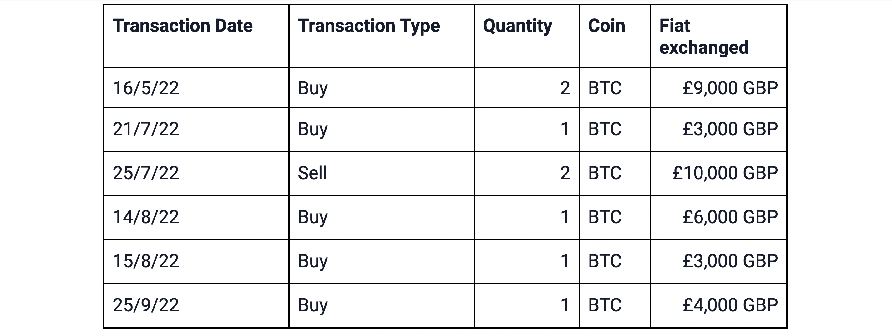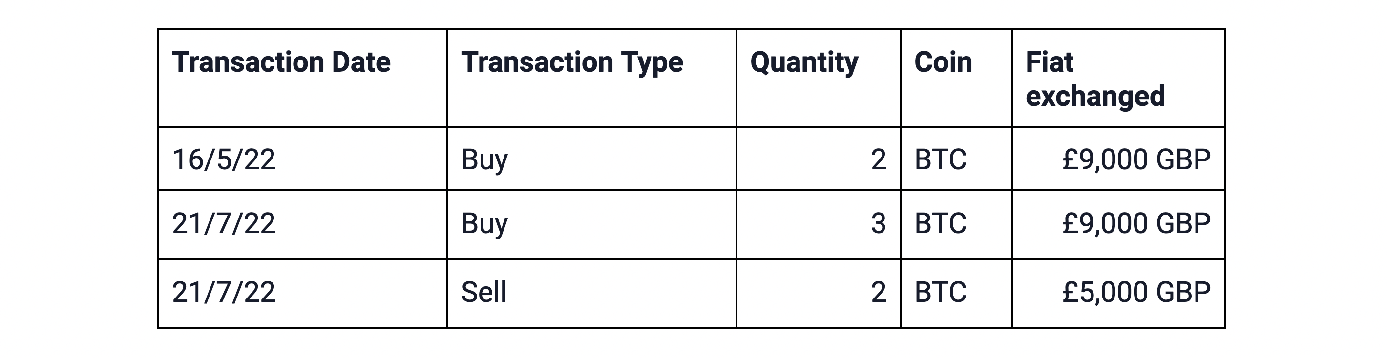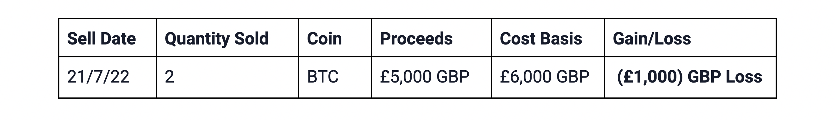 To calculate the gain or loss from the disposition on 21/7/22, the same day rule is applied. The disposition is first matched with the acquisition occurring on the same day. The cost basis of the 2 BTC disposed of is £6,000 GBP (£9,000 GBP / 3 BTC = £3,000 GBP per BTC X 2 BTC = £6,000 GBP Cost Basis), resulting in an overall loss of (£1,000) GBP.