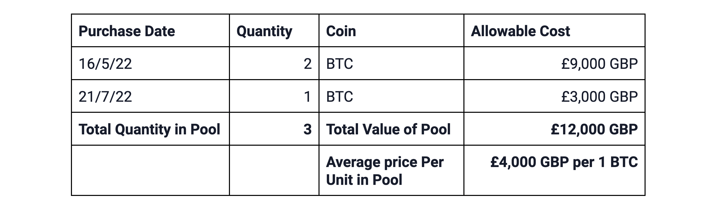 - The Section 104 Pool - Tokens leftover after the above two rules are applied are added to that specific token’s “Section 104 Pool”. The cost basis of assets in the Section 104 Pool is calculated using the average cost method, where the allowable costs of all tokens in the pool is divided by the total number of tokens in the pool to determine the cost basis per asset.