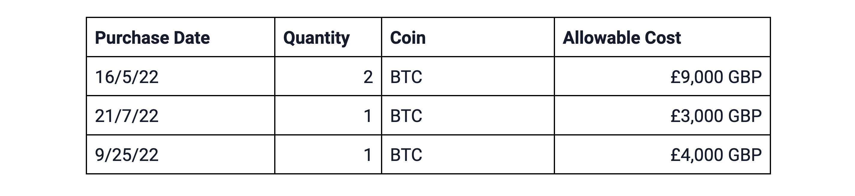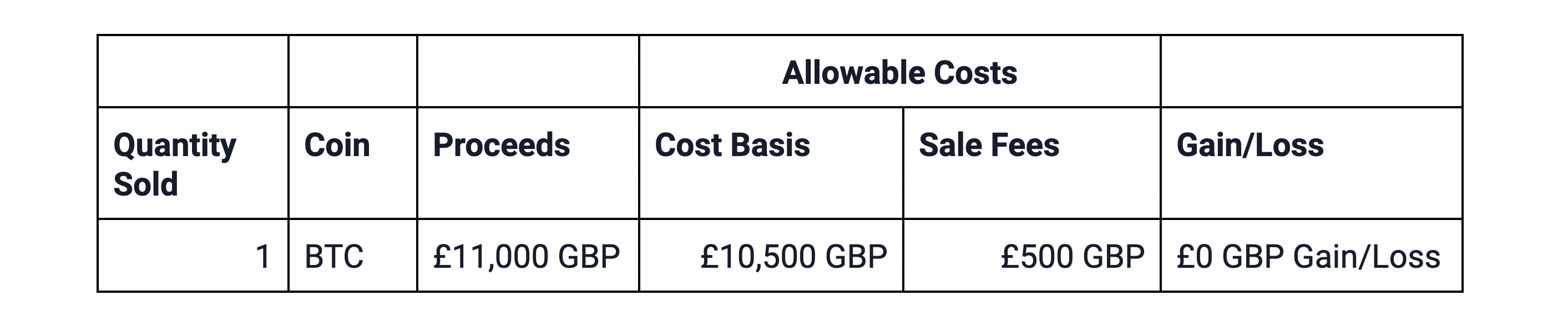 Assume the 1 BTC purchased in the above example is the only asset in the Section 104 Pool. You later sell 1 BTC for £11,000 and pay £500 in fees that qualify as allowable costs.